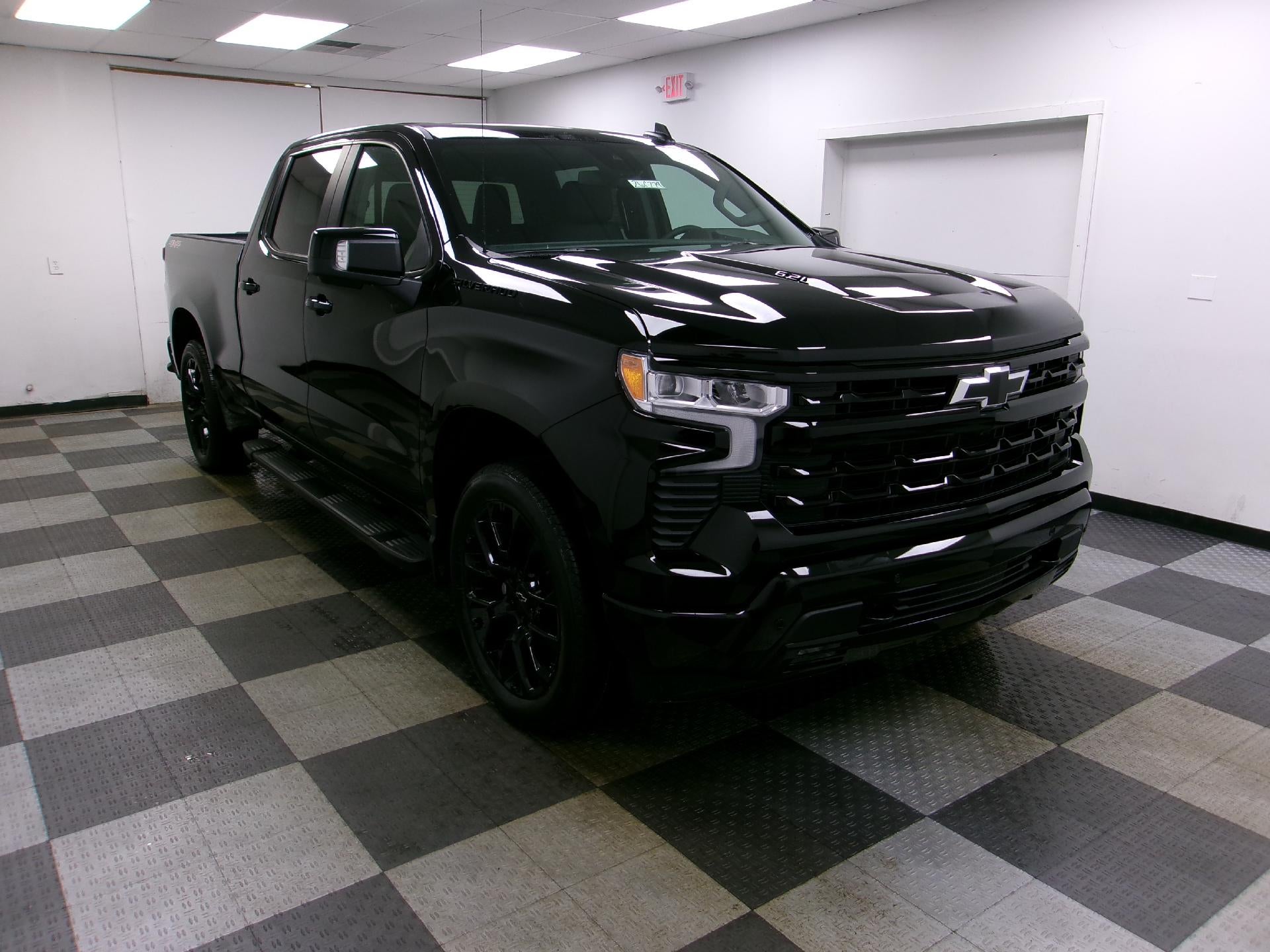 Black 2026 Chevrolet Silverado 1500 RST 4WD 10-Speed Automatic EcoTec3 6.2L V8 10-Speed Automatic, 4WD, Black Leather, 10-Way Power Driver Seat w/Lumbar, 12.3" Multicolor Reconfigurable Digital Display, 120-Volt Bed Mounted Power Outlet, 120-Volt Interior Power Outlet, 170 Amp Alternator, 2 USB Data Ports, 220 Amp Alternator, 3.23 Rear Axle Ratio, 4-Wheel Disc Brakes, 40/20/40 Front Split-Bench Seat, 6 Speakers, 6-Speaker Audio System, 6" Rectangular Black Tubular Assist Steps (LPO), ABS brakes, Air Conditioning, All-Star Edition, All-Weather Floor Liner (LPO), Alloy wheels, AM/FM radio: SiriusXM with 360L, Apple CarPlay/Android Auto, Auto High-beam Headlights, Auto-Locking Rear Differential, Automatic Emergency Braking, Automatic temperature control, Auxiliary External Transmission Oil Cooler, Black Name Plates (LPO), Black Tailgate CHEVROLET Lettering (LPO), Bluetooth® For Phone, Brake assist, Bumpers: body-color, Chevytec Spray-On Black Bedliner, Cloth Seat Trim, Color-Keyed Carpeting Floor Covering, Compass, Convenience Package, Convenience Package II, Dark Essentials Package (LPO), Deep-Tinted Glass, Delay-off headlights, Driver door bin, Driver vanity mirror, Dual Active Exhaust, Dual front impact airbags, Dual front side impact airbags, Dual Rear USB Ports (Charge Only), Dual-Zone Automatic Climate Control, Electric Rear-Window Defogger, Electronic Cruise Control, Electronic Stability Control, Electronic Transmission Range Selector Shifter, Emergency communication system: OnStar, External Engine Oil Cooler, EZ Lift Power Lock & Release Tailgate, Floor Mounted Center Console, Following Distance Indicator, Forward Collision Alert, Front anti-roll bar, Front Bucket Seats, Front Center Armrest w/Storage, Front dual zone A/C, Front fog lights, Front Frame-Mounted Black Recovery Hooks, Front LED Fog Lamps, Front Pedestrian Braking, Front reading lights, Front Rubberized Vinyl Floor Mats, Front wheel independent suspension, Fully automatic headlights, HD Rear Vision Camera, HD Surround Vision, Heated door mirrors, Heated Driver & Front Outboard Passenger Seats, Heated front seats, Heated Power-Adjustable Outside Mirrors, Heated Steering Wheel, Heated steering wheel, High Capacity Suspension Package, High Gloss Black Mirror Caps, Hitch Guidance, Hitch Guidance w/Hitch View, Illuminated entry, In-Vehicle Trailering System App, Inside Rear-View Mirror w/Tilt, Integrated Trailer Brake Controller, IntelliBeam Automatic High Beam On/Off, Keyless Open & Start, Lane Keep Assist w/Lane Departure Warning, Leather Package, Leather-Appointed Front Seat Trim, LED Cargo Area Lighting, Low tire pressure warning, Manual Tilt/Telescoping Steering Column, Occupant sensing airbag, OnStar Services Capable, Outside temperature display, Overhead airbag, Overhead console, Panic alarm, Passenger door bin, Passenger vanity mirror, Perimeter Lighting, Power door mirrors, Power driver seat, Power Front Windows w/Driver Express Up/Down, Power Front Windows w/Passenger Express Down, Power Rear Windows w/Express Down, Power Sliding Rear Window w/Rear Defogger, Power steering, Power Tailgate, Power windows, Preferred Equipment Group 1SP, Premium audio system: Chevrolet Infotainment 3 Premium, Premium Bose 7-Speaker Sound System, Protection Package, Radio data system, Radio: Chevrolet Infotainment 3 Premium System, Rear 60/40 Folding Bench Seat (Folds Up), Rear Cross Traffic Braking, Rear Pedestrian Alert, Rear reading lights, Rear Rubberized-Vinyl Floor Mats, Rear step bumper, Rear Wheelhouse Liners, Rear window defroster, Remote keyless entry, Remote Vehicle Starter System, Safety Package, Security system, Single Outlet Exhaust, SiriusXM w/360L Trial Subscription, Speed control, Speed-sensing steering, Split folding rear seat, Standard Suspension Package, Standard Tailgate, Steering Wheel Audio Controls, Steering wheel mounted audio controls, Tachometer, Teen Driver, Telescoping steering wheel, Theft D